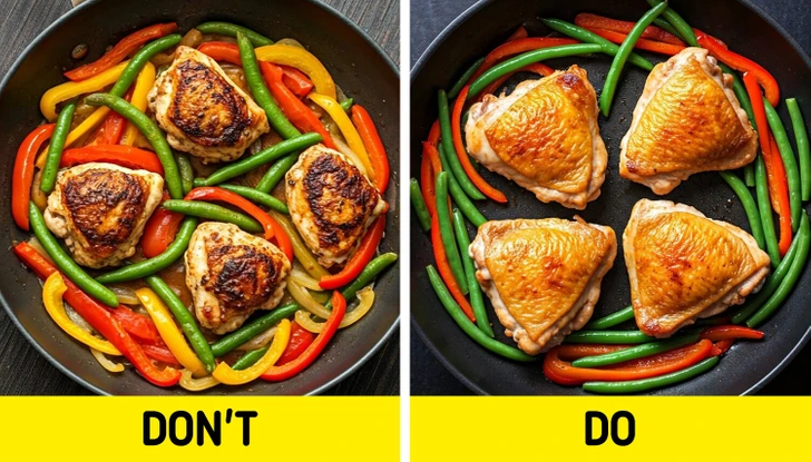 - Overcrowded pans trap moisture, causing food to steam instead of sear.
