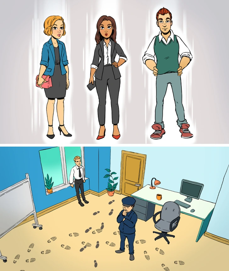 A businessman discovers important documents missing from his office. The police question three employees. All claim they haven’t been in the office that day.