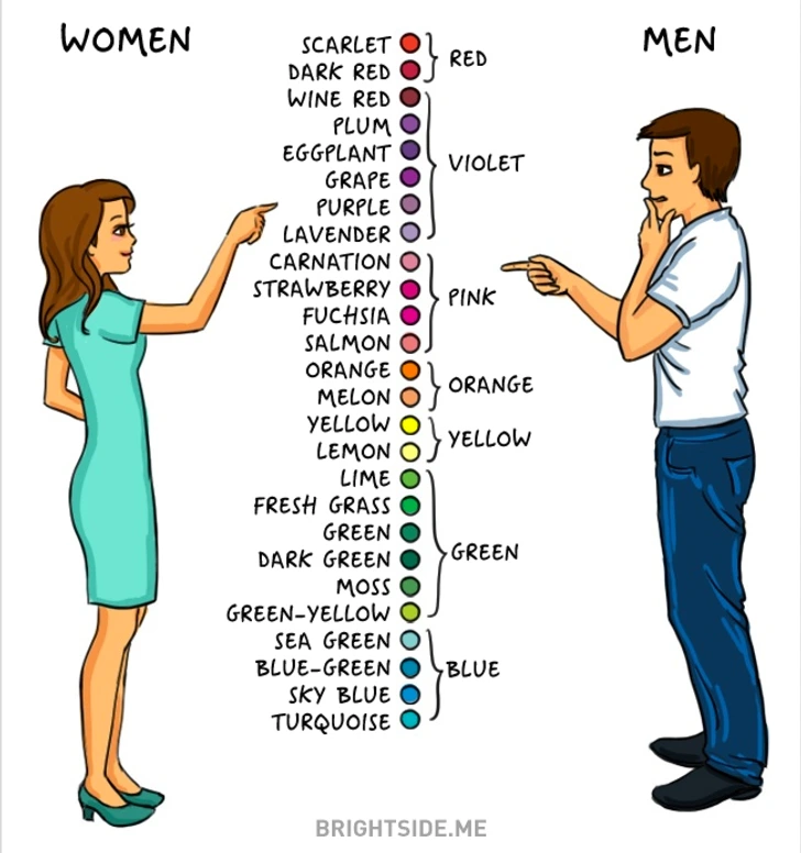 The same goes for shades of pink, purple, and green. Women see a world of variations, while men simplify it all down to basic color names.