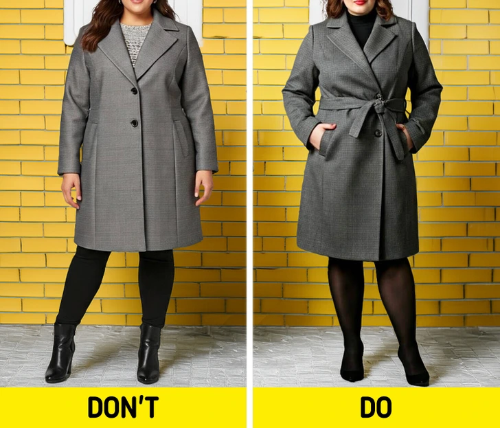 A well-fitted wool or cashmere coat is a must-have for winter. Tailored coats with a belted waist help define your curves, creating an elegant hourglass figure.