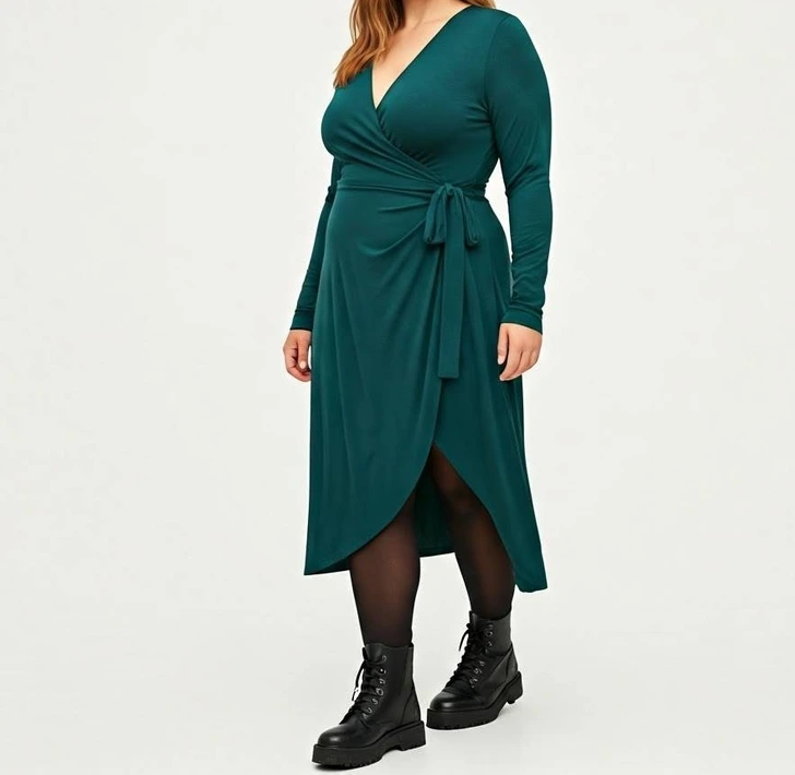 Pair a long-sleeved wrap dress with opaque tights and chunky boots for a stylish winter outfit that blends elegance with warmth.