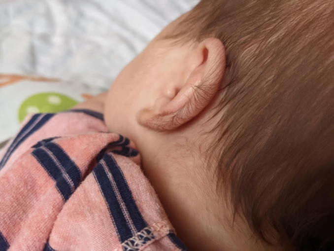 A baby with fluffy ears? Yep, it happens. That soft fuzz is called lanugo. It’s perfectly natural and tends to disappear shortly after birth.