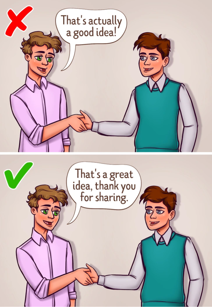 Your words have power. A lot of power. Saying things like, “Actually, that’s a good idea,” might sound innocent, but “actually” implies surprise—and can sound condescending. Just say, “That’s a great idea.”