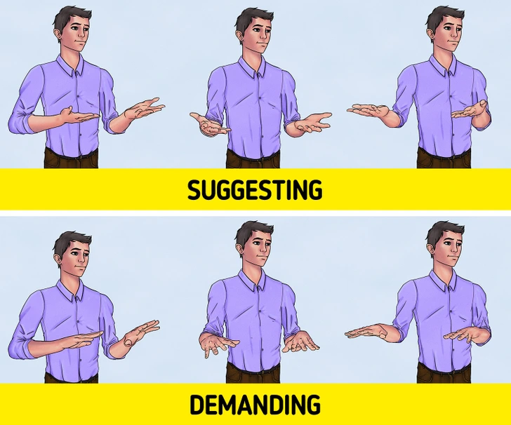 Now flip it. Palms down suggest authority and control. It’s a more commanding gesture, often used when someone’s giving instructions or trying to establish dominance.