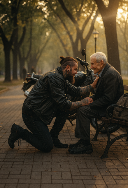 On that bench sat an elderly man with silver hair and hands marked by years of hard work. His eyes, though aged, still had a spark — the unmistakable glint of someone who’d once lived wild and free on two wheels. To any stranger walking by, it looked like an unlikely pair — a bearded, tattooed biker in black leather talking to a quiet old man in a worn coat. But to those who understood the road, it was a meeting between two souls cut from the same cloth.