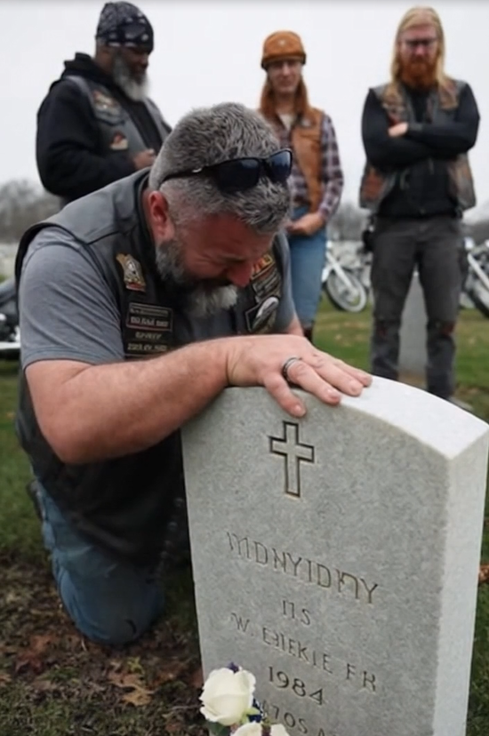At the front, Tank, the road captain, knelt by the headstone. His leather vest bore the marks of years on the road—patches worn and faded, each one telling a story. His hands, rough from wrenching engines and gripping handlebars, trembled as they rested on the cold marble. His voice broke through the stillness. “Miss you, brother,” he whispered. “The road feels emptier without you.”