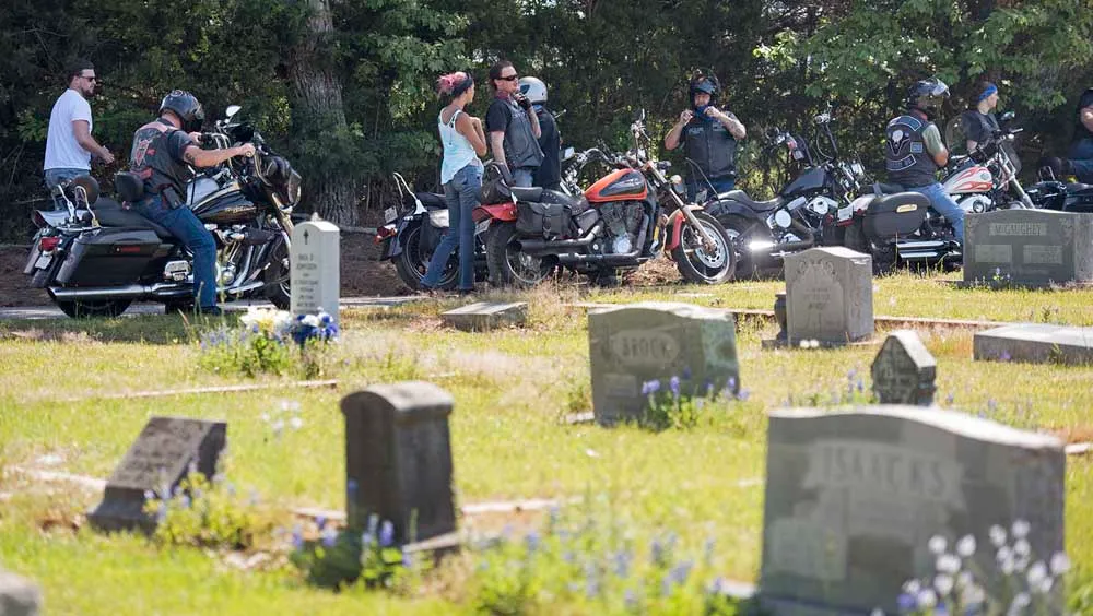 The morning was gray, the kind that carried a heavy silence before a storm. The air was damp, filled with the mix of gasoline and wet earth. Motorcycles rolled slowly through the cemetery gates, chrome glinting dimly under a clouded sky. These riders weren’t just a club—they were family. Each one carried the weight of loss on their shoulders, the sound of their engines echoing the rhythm of their hearts.