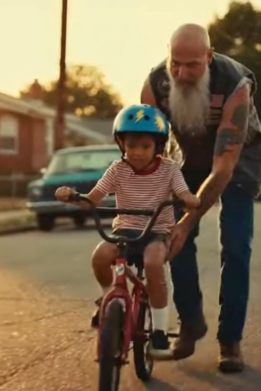 As the boy gripped the handlebars, the biker steadied the back of the bike and placed a steady hand on the boy’s shoulder. “Just pedal. I’ll run with you,” he assured him.