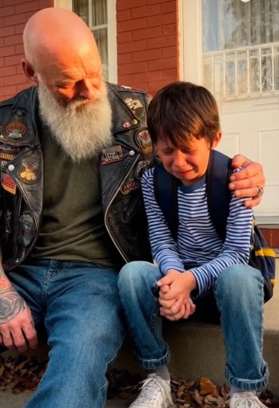 The boy glanced up, startled but not frightened. There was something steady and safe in the biker’s voice that made him answer honestly.