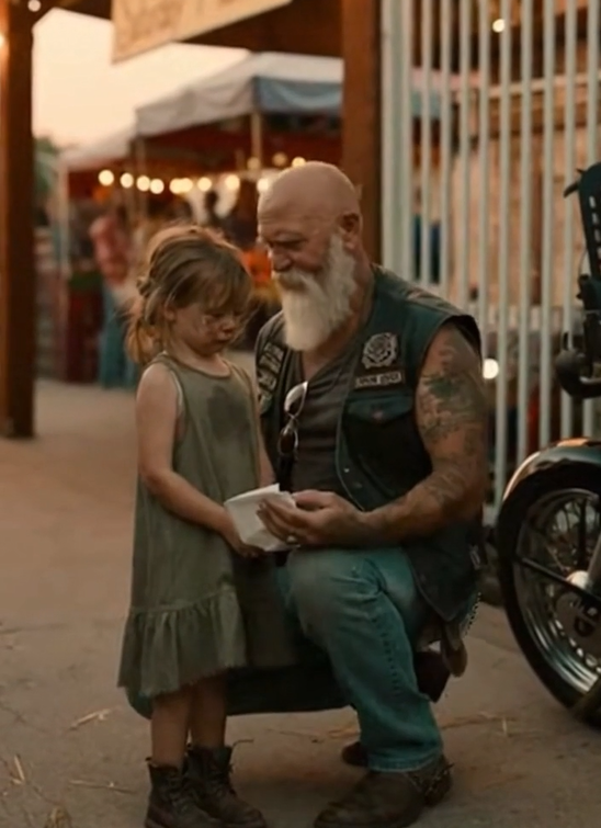 He parked his Harley, flipped down the kickstand, and walked toward her with slow, steady steps. He understood how he looked: big frame, leather vest, boots scuffed from long rides. But he softened everything in his voice when he spoke.