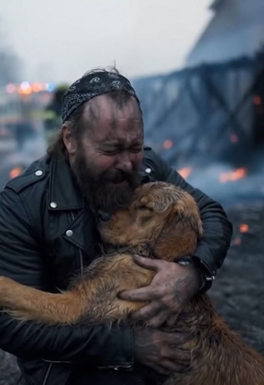 The night bled smoke and rain, the kind that makes even steel tremble. Jack “Diesel” Rourke stood before what once was his home — now reduced to ashes. Flames had devoured everything: the walls he built, the Harley he restored with his own hands, and the memories that once made that house feel alive. But none of it mattered anymore. What truly broke him was lying lifeless in his arms — his golden retriever, Cooper.