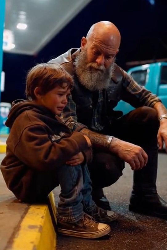 But just as he swung his leg off the bike, something caught his eye—something small, still, and heartbreakingly out of place. A young boy, maybe eight or nine, sat curled up beside the ice machine, knees pulled tight to his chest, arms wrapped around himself against the cold. His clothes didn’t fit, his shoes were worn through, and his face was streaked with dirt from the road.