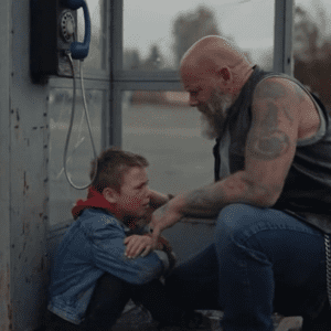 “You lost?” the biker asked, voice rough yet carrying a comforting warmth, a tone that suggested life had hardened him, but not erased his heart.