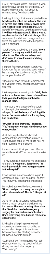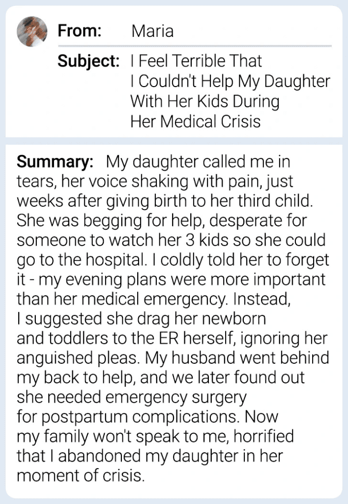 Maria’s story began with a distress call from her daughter, Sarah, who was in the midst of a medical emergency. Sarah, a mother of three, needed urgent assistance and reached out to Maria, seeking both physical help and emotional reassurance. However, Maria’s response was less than supportive. Instead of rushing to her daughter’s side, Maria allowed her fears and protective instincts over her husband to cloud her decision-making. She told Sarah, “You chose to have three kids; you need to figure out how to manage them.”