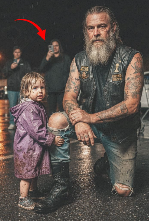 The little girl didn’t flinch. She pressed her cheek to the wet leather of my pant leg like she’d found an anchor in a storm. Her knuckles were white against my boot, her entire body shaking—but she wouldn’t let go.