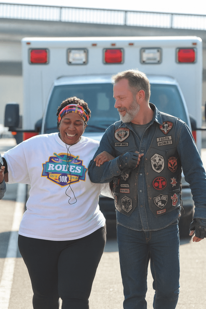 The medics arrived, checked my vitals, and warned me my heart was in danger. But Rob—this stranger in black leather—talked them into a compromise. “Drive the ambulance beside us,” he said. “If she collapses, you’re right there. But she’s finishing this race.”
