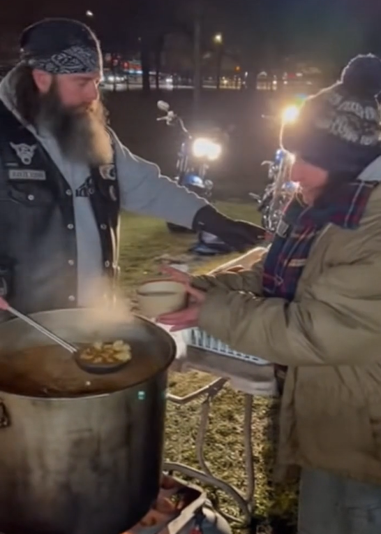 “Hey brother, grab a bowl,” said Angel, one of the bikers with a soft voice that didn’t match his size. He handed a cup of steaming soup to an elderly man shivering in the cold. The man’s hands trembled as he took it, his eyes glistening with gratitude.