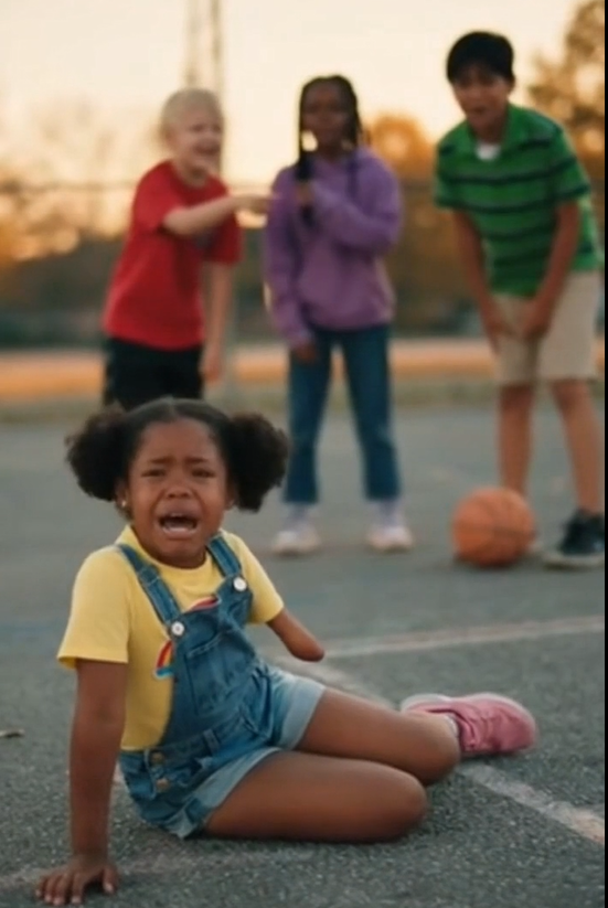 Off to the side, on a worn wooden bench, sat a little girl — no more than six years old. Her eyes were swollen from crying, her face streaked with tears. The left sleeve of her pink shirt was empty, folded neatly where her arm should have been. Just moments earlier, some kids had teased her, calling her names and refusing to let her join their games.