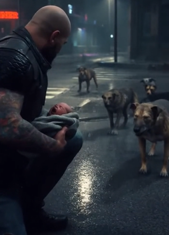Under a flickering streetlamp, he saw it—a tiny bundle wrapped in a worn-out blanket, lying helplessly on the ground. Surrounding the baby were six stray dogs, their fur soaked, their ribs showing beneath the skin, and their eyes gleaming like molten amber. They weren’t just watching. They were circling, growling, torn between hunger and confusion.