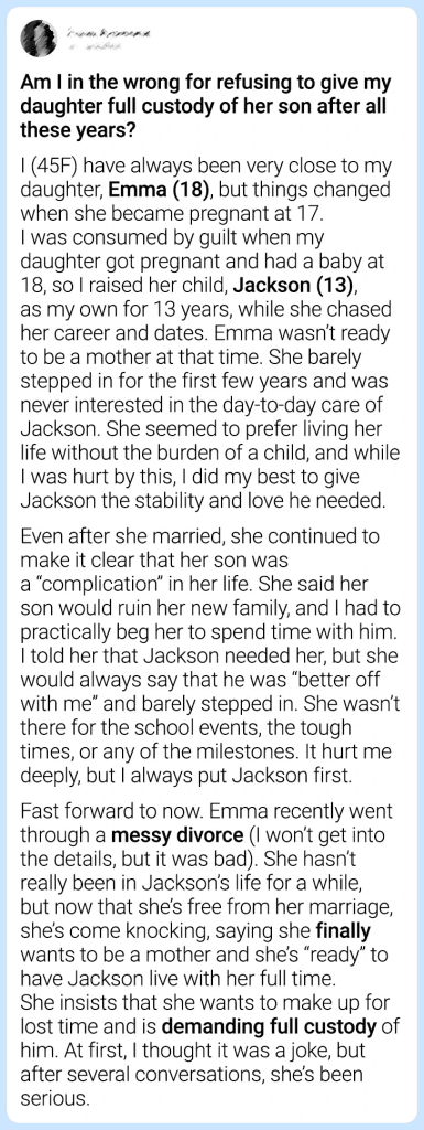Dolores, a 45-year-old grandmother, has devoted the last 13 years to raising her grandson, Jackson. She stepped in when her daughter, Emma, was unprepared for motherhood. Now, after a painful divorce, Emma is determined to reclaim full custody of Jackson, saying she’s finally ready to be a mom. Caught between her love for her daughter and her responsibility to protect her grandson, Dolores is grappling with a decision that could impact her family forever.