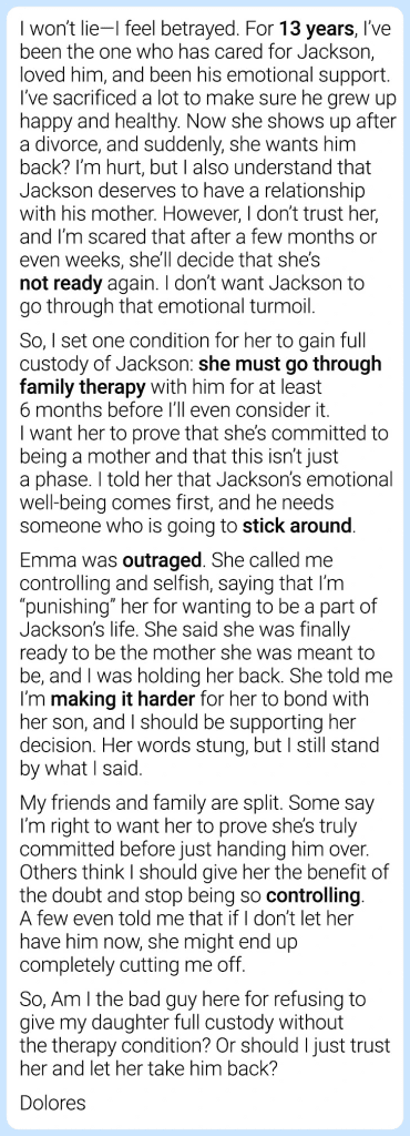 Custody battles are rarely black and white, especially when the well-being of a child is at stake. Dolores is navigating a minefield of emotions—love for her daughter, a sense of duty to her grandson, and the fear of making the wrong decision. At the heart of her dilemma is a simple but powerful question: What’s best for Jackson?