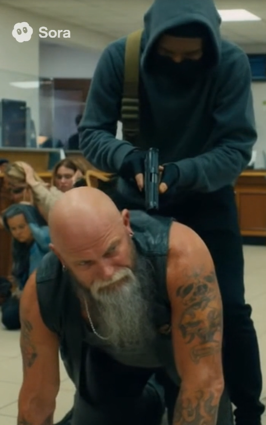 Without hesitation, the bikers marched toward the bank. As they opened the door, the robbers turned, guns raised. The hostages, huddled near the counter, gasped in shock. Tank stood tall, his chest out, eyes locked on the robbers.