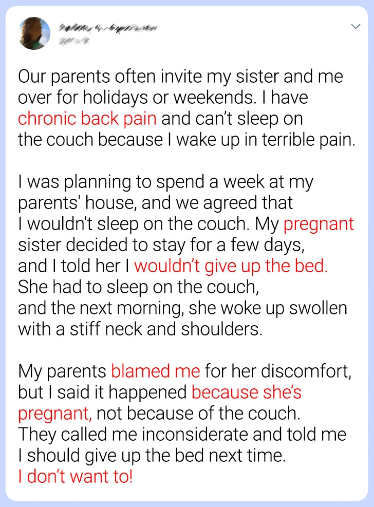 Family dynamics can be complicated. When our reader—a person managing chronic health issues—was asked to give up her bed for her pregnant sister during a family gathering, emotions ran high. On one side, the sister’s pregnancy warranted extra comfort. On the other, our reader’s chronic condition made sleeping on less supportive surfaces unbearable. The resulting tension left the family divided and both parties feeling misunderstood.