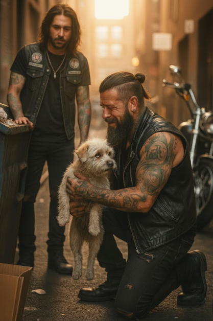 Bulldog didn’t hesitate. He reached into the dumpster, careful hands brushing against crumpled cardboard and debris. The dog yelped softly but made no attempt to fight. He lifted it gently, cradling it against his chest. Its tiny body trembled against his warmth. “It’s okay, little buddy. You’re safe now,” Bulldog whispered. The dog pressed its nose into his leather jacket as if understanding that help had arrived.