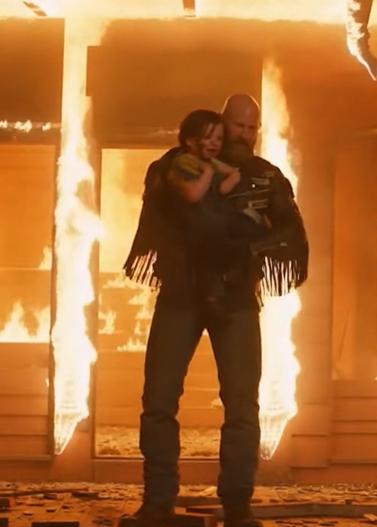 The boy’s cries intensified, but Bulldog’s face remained unshakable—set jaw, fierce eyes, calm resolve. In that instant, he became more than a man; he was a fortress, a shield against the terror that surrounded them. Sparks rained down from the ceiling, some catching on his leather jacket, yet he pressed onward, guided by courage and sheer determination.