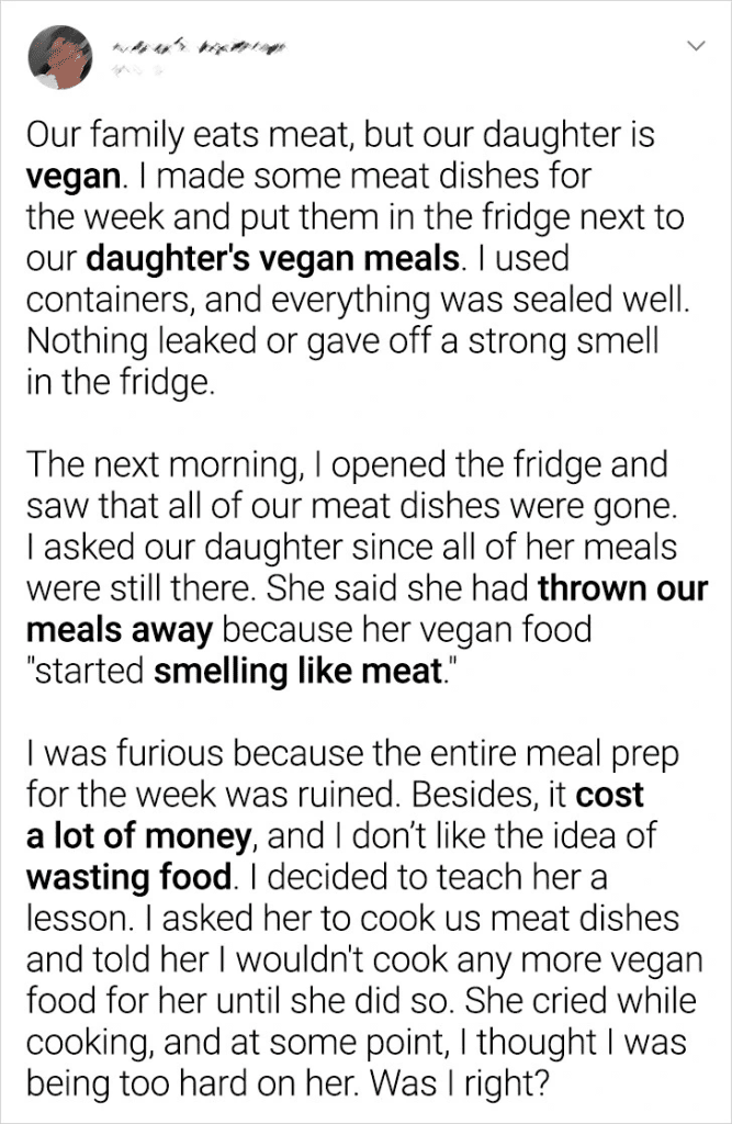 Now, this is where the real problem lies. While respecting her daughter’s dietary choices, the mother also had a responsibility to ensure that the entire family’s food needs were met. The sudden disposal of perfectly good meat felt not only wasteful but also disrespectful to the efforts made to accommodate her lifestyle. It’s a classic case of good intentions going sideways when boundaries aren’t properly communicated or respected.