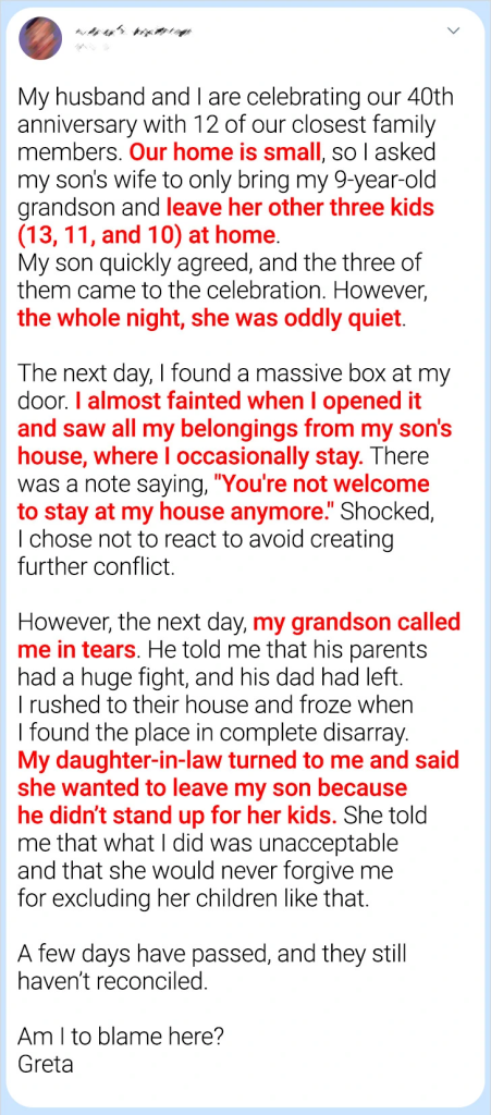 Family milestones, like anniversaries, are meant to be joyful occasions. But for Greta, her 40th wedding anniversary brought unexpected conflict. With a packed home and limited space, she asked her daughter-in-law to bring only one of her three children. What started as a practical request quickly spiraled into a misunderstanding that left both sides feeling hurt. Now, Greta is seeking ways to repair the relationship and restore harmony.