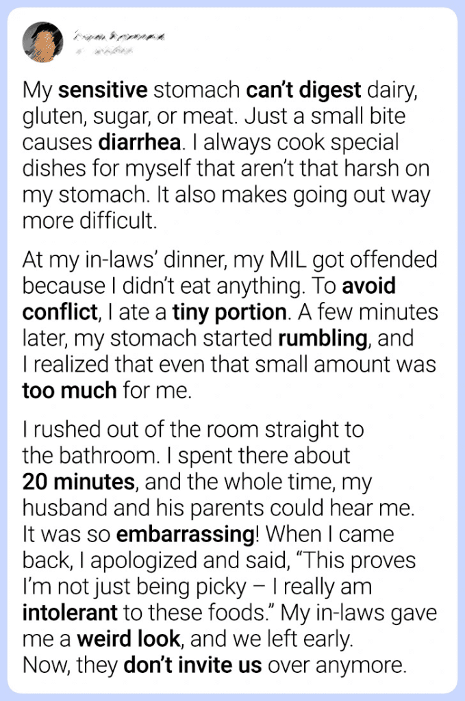 Navigating food intolerances can be tricky, especially when your loved ones don’t fully understand the challenges you face. One of our readers shared a relatable story with us. During a family dinner at her in-laws’, she tried to keep the peace by eating a small portion of food she typically avoids due to her highly sensitive stomach. Unfortunately, even that small bite didn’t sit well, leading to an embarrassing situation. Let’s delve into this story and explore ways to handle food intolerances around family gatherings without compromising health or comfort.