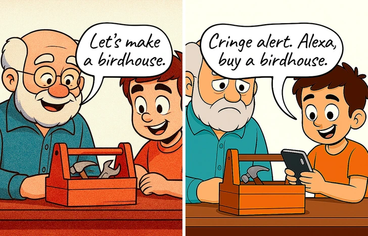 One comic sums it up perfectly: A grandson explains TikTok to his grandpa. The grandpa ends up recording a video with the wrong filter—turning himself into a sparkly unicorn. They laugh so hard they forget to fix it. That’s what real connection looks like in the digital age.