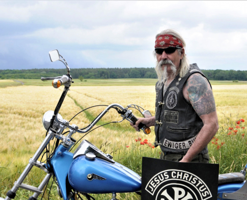 As the sun began to dip, the biker wheeled Noah back to the sidewalk. The Harley gleamed beside them, chrome catching the orange light.