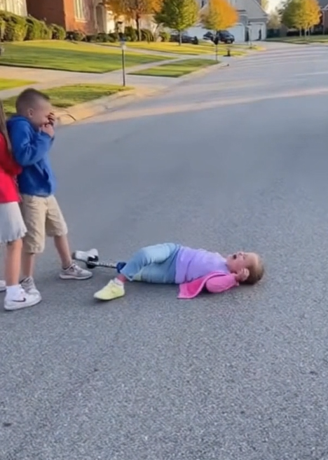 When Hammer stepped off his bike, he noticed a girl lying in the dust beside the swings. She was small—no more than seven—struggling to push herself up while a single crutch lay out of reach. Her prosthetic leg stuck out from the sand, and three kids hovered nearby, offering no help. Instead, one boy snickered while another shrugged like her pain was nothing but an inconvenience.