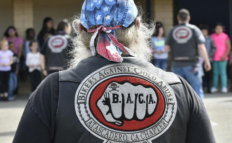 The biker kept his arm around the boy, shielding him from the wind as he explained.