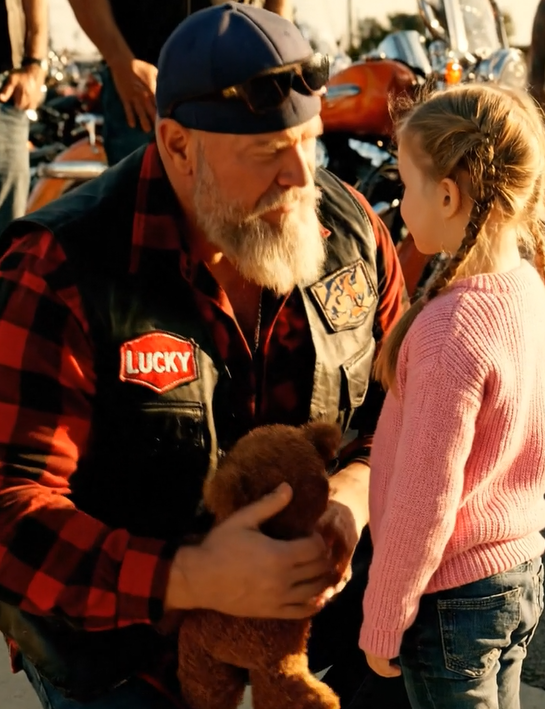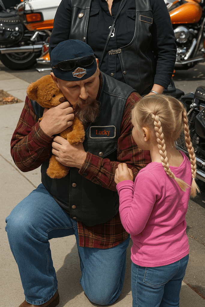 The man’s vest read “Tank.” Six-foot-four, beard silver at the edges, hands scarred from a life of hard miles. He took the bear like it was made of spun glass. His shoulders trembled. He slid to his knees. Then he fished a faded photo from his wallet: a gap-toothed little girl with pigtails, cradling a near-twin to Emma’s bear beside a pink bike with training wheels. “Lily,” he said, voice gravel and grief. “She had one just like this.”