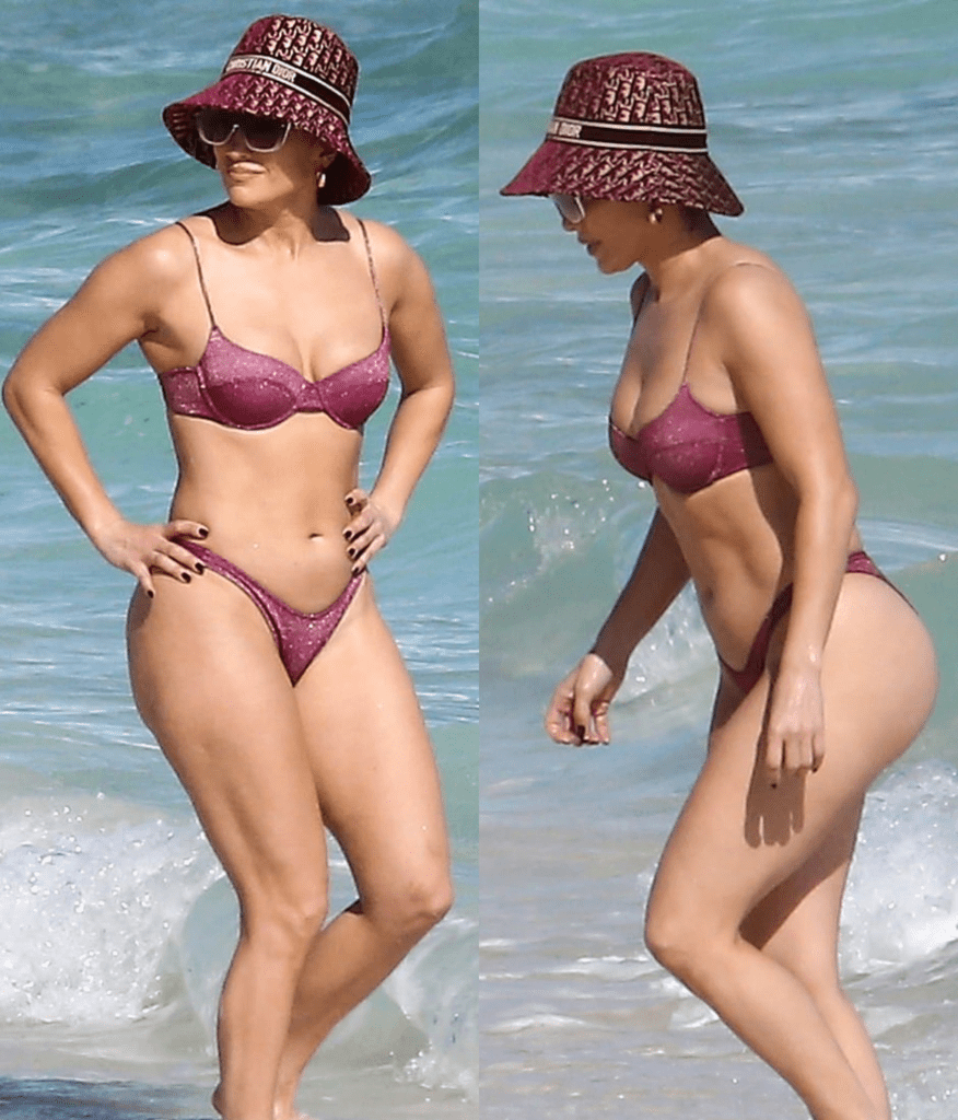 Her high-fashion swimwear, featuring structured cups and a shimmering finish, highlighted her age-defying allure. Paired with high-cut bottoms that accentuated her long, toned legs, Lopez effortlessly blended glamour with casual beach vibes.