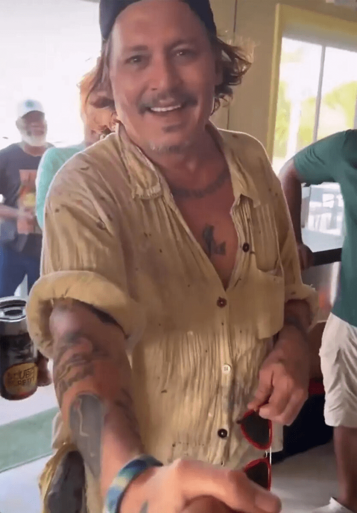 Before Day Drinker news broke, Depp was spotted at a beach bar in the Bahamas, looking relaxed and radiant. He chatted with locals, flashed a big smile, and just looked—well, happy.