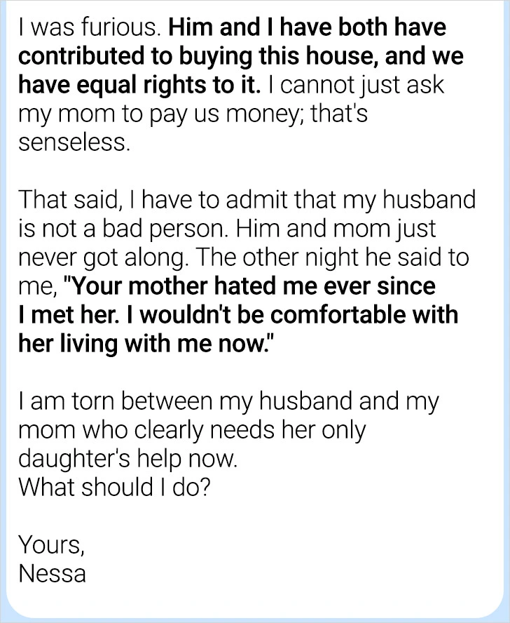 Nessa’s husband has introduced a financial element by suggesting that her mother should pay rent. This might feel unfair to Nessa, who views her mother’s presence as family support. However, discussing alternative financial arrangements can help bridge this gap.