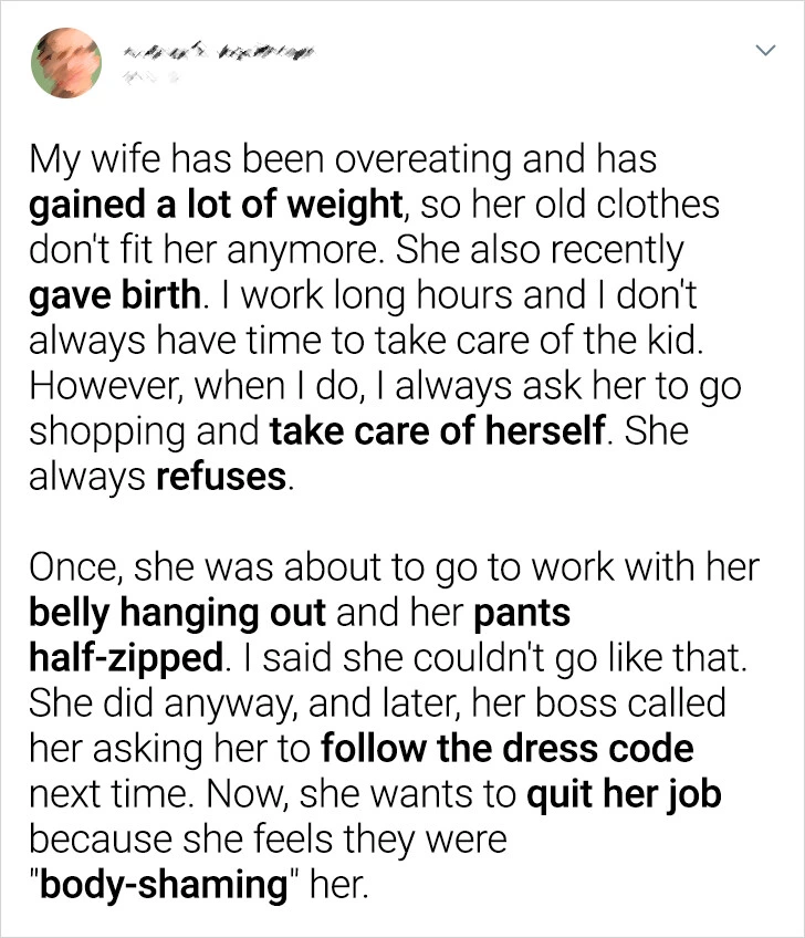 Bringing a new life into the world is a beautiful journey, but it also brings significant changes to every aspect of a mother’s life—especially her body. After giving birth, it’s common for new moms to experience body image struggles. This can be even harder when judgment or unintentional pressure comes into play. One of our readers shared his story with us: he tried to encourage his wife to focus on self-care after she gained weight postpartum. But one morning, she made an unexpected decision to quit her job, and her reason surprised him. Let’s explore this story and how we can approach similar challenges with empathy and understanding.
