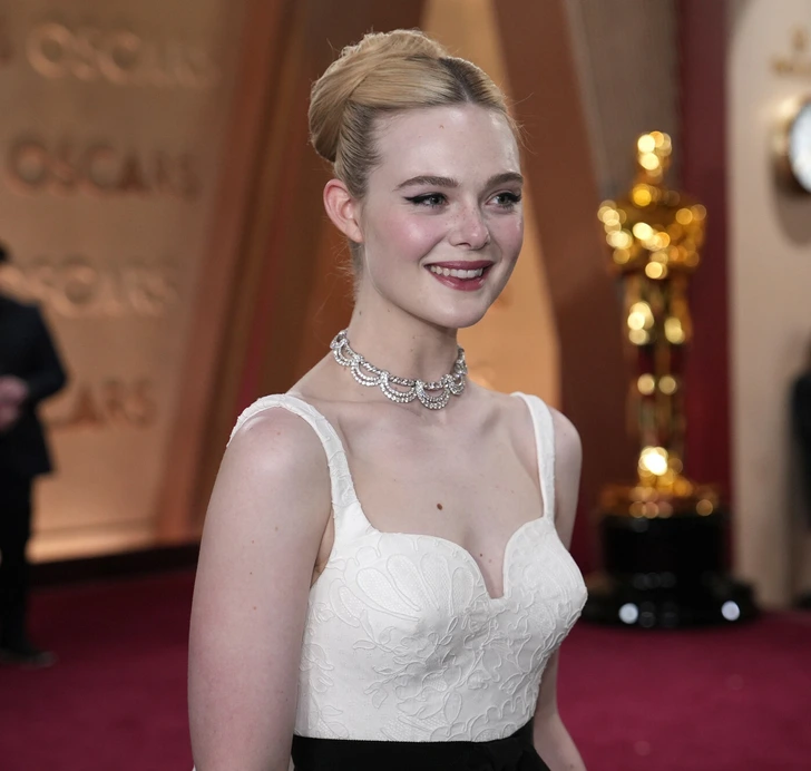 Elle Fanning’s next—she’s killing it with ‘60s eyeliner! That cat-eye flick, big lashes, pink lips—it’s vintage glam with a fresh spin! Ever seen old-school feel so now? Elle’s throwback look’s a timeless banger—she’s a red carpet classic!