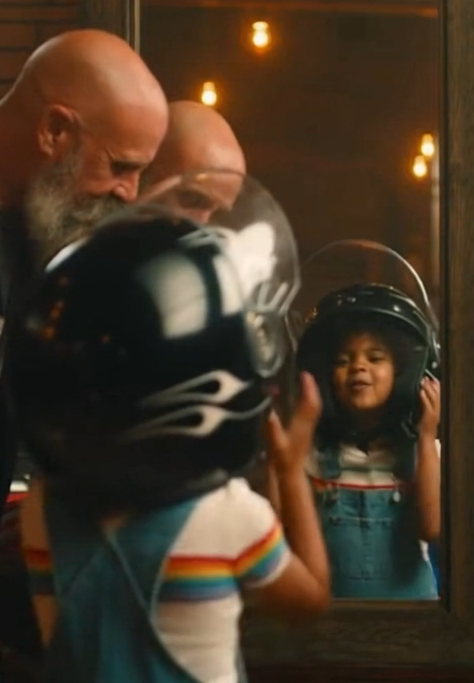 He placed the helmet onto her head, though it was hilariously oversized. It slid down past her eyebrows, and her little hands had to hold it up just to see. The moment she turned to look at her reflection in the diner window, something shifted—a spark, a glow, a transformation.