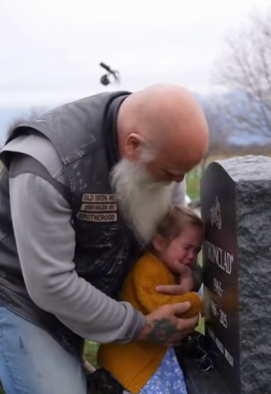 Behind him sat a little girl named Emma, six years old, with soft brown curls tucked under a pink helmet. Her small hands clung tightly to the back of his leather vest, and in her lap rested a bouquet of wildflowers. She wasn’t his daughter — not by blood, anyway — but in every way that mattered, she was his family now.