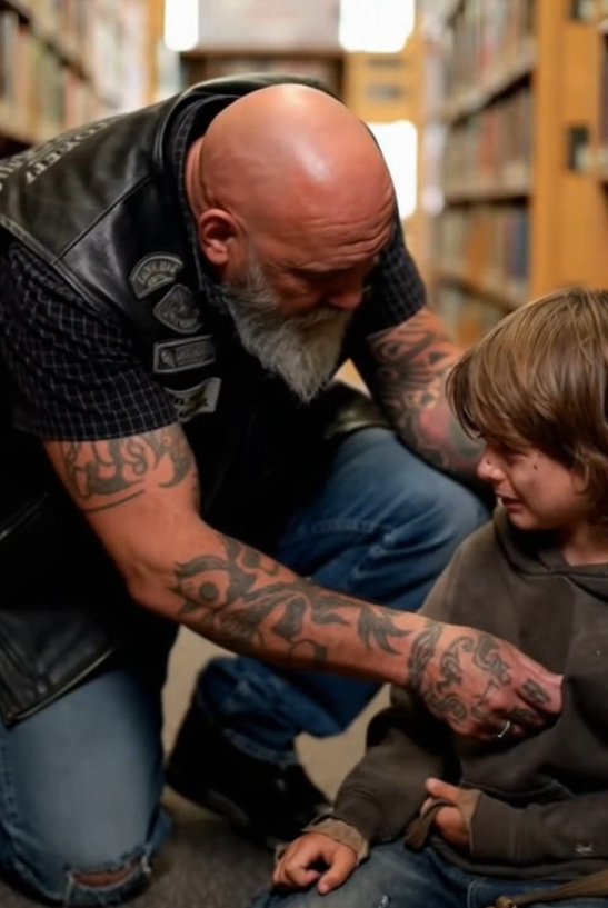 The biker crouched beside him, his voice kind but firm. “You don’t have to thank me. Reading takes guts. Most folks these days are too scared to use their brains.”