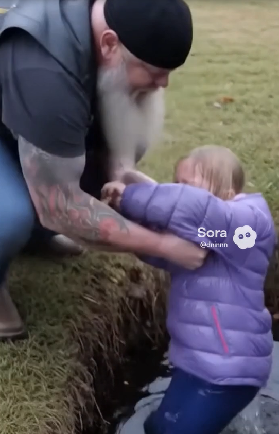 A small girl — maybe seven years old — was trapped in the shallow ditch, her clothes soaked, her teeth chattering as she tried to climb up the slippery mud. Each time she reached for the edge, her hands slid back down. She was exhausted, terrified, and freezing.