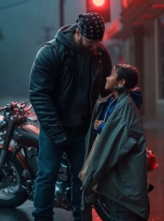 Without hesitation, Bear unzipped his heavy rain jacket — thick leather lined with warmth from long rides — and draped it over Tommy’s shoulders. The jacket nearly swallowed him whole.