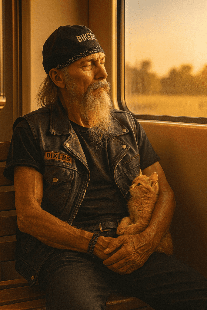 The subway car smelled of metal, rain, and city dust—the kind of scent only big cities carry. I was staring absently at my phone when I noticed him. A biker, easily in his sixties, sat across from me, clutching a tiny orange-and-white kitten to his chest. His leather vest was covered in patches, his hands were scarred, and his beard carried streaks of gray like battle scars from time itself.