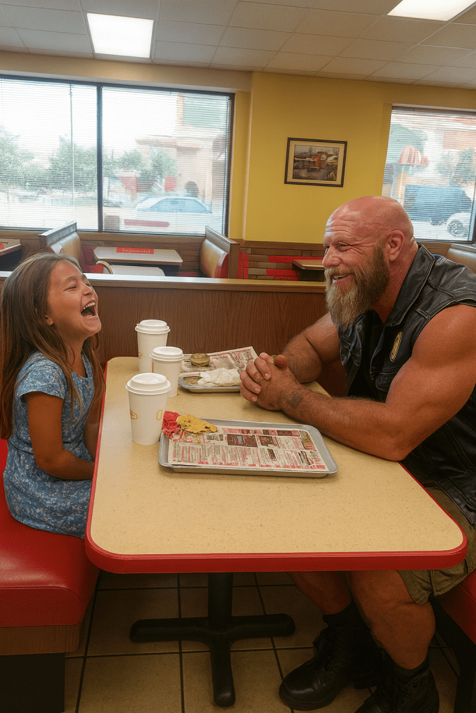 When the officers entered, the restaurant fell silent. The little girl, Lily, froze. Her big brown eyes filled with fear. “Are they taking you away too? Like they took Daddy?” she asked, clutching the biker’s arm.
