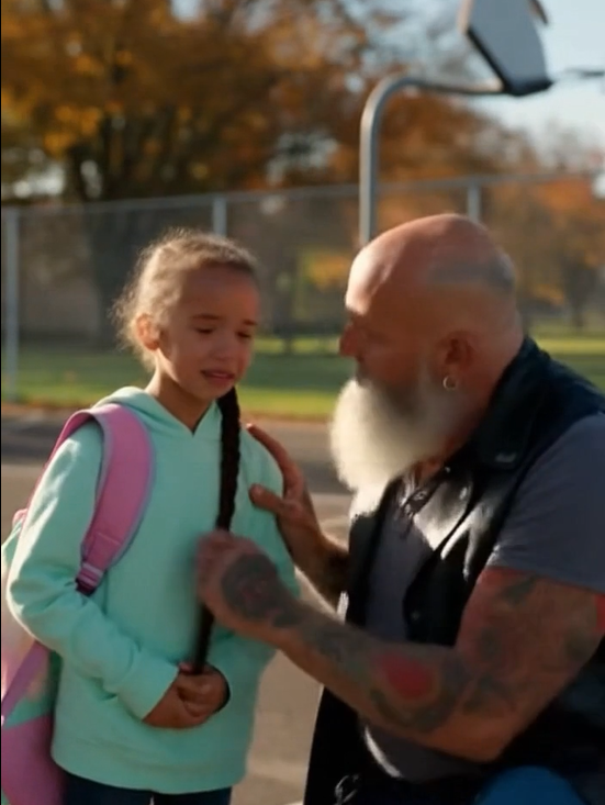 As Bear knelt in front of her, the sight alone could make anyone pause. A massive man, built like he’d wrestled life and won more than once, bent down gently to adjust the ribbon in a little girl’s hair. Leather creaked. Tattoos shifted. But his hands—steady, patient, practiced—worked as if they’d always belonged to that task.